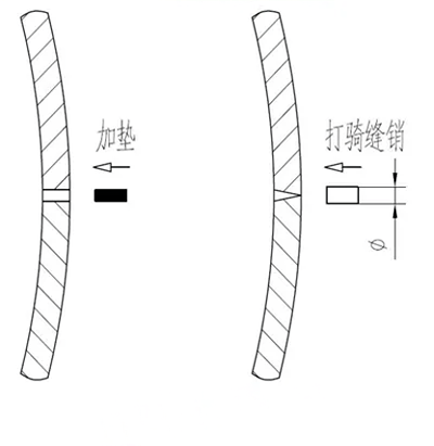 如果縫隙沿筒殼內(nèi)外不均勻,一般是外側(cè)頂緊,造成貼緊的假象。可以從外側(cè)在接合縫部位打騎縫銷并可靠固定,將縫隙處撐緊。