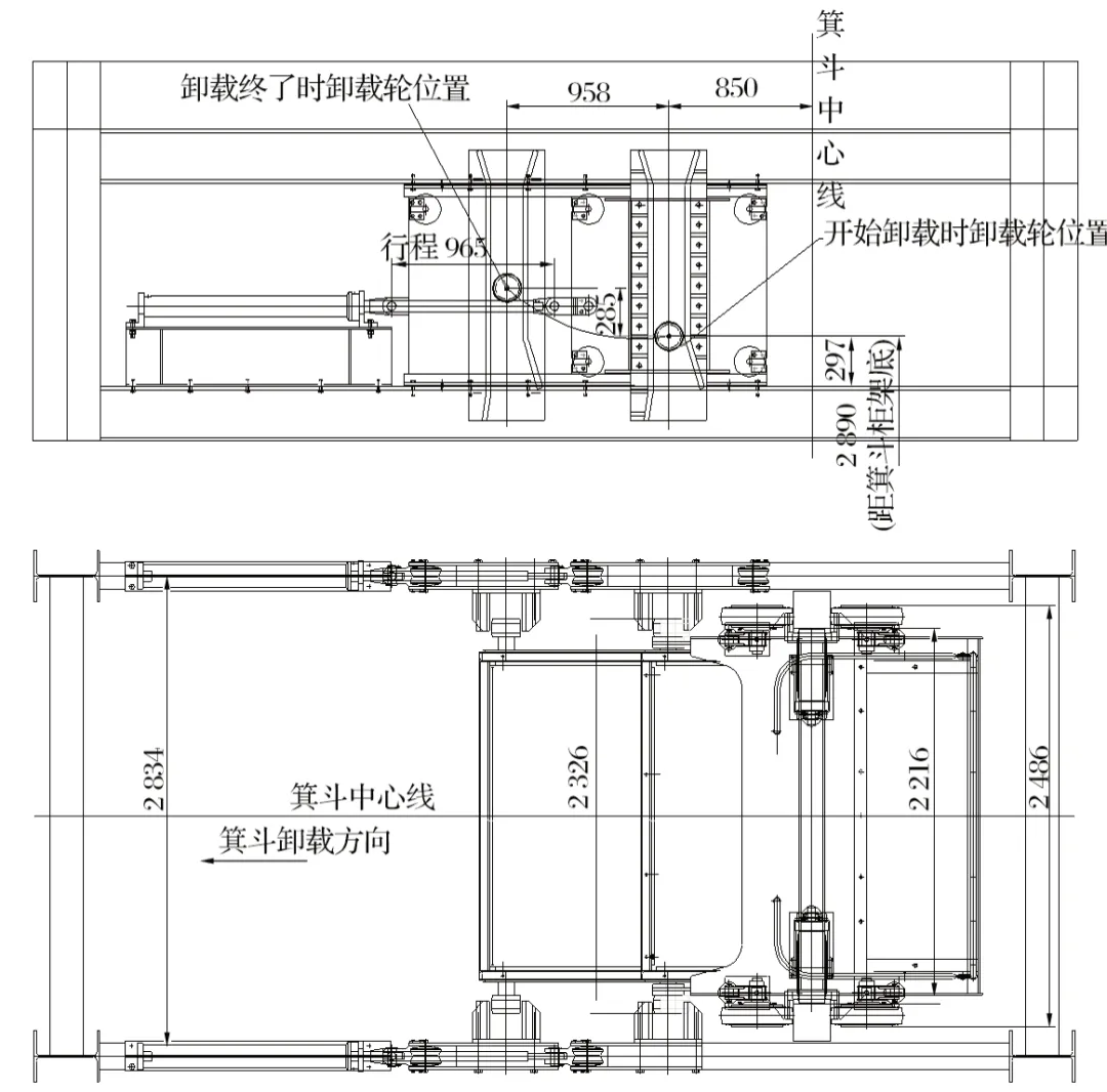 (2)這種2個卸礦點應用在同一箕斗的卸礦方式在我國尚屬shou 次,會澤礦3號豎井是目前wei 一在用的雙卸載點礦井。一般的礦井一個井筒采用一個卸礦點,多個水平的多點卸礦一般要打多個井筒。為了多點卸礦功能的順利實現,移動直軌到位精度偏差不能超過±5 mm,并且應滿足鋼絲繩正常的彈性變形伸縮量的卸載要求。多點卸礦為礦山開采節約了大量成本,移動直軌卸載裝置如圖2所示。