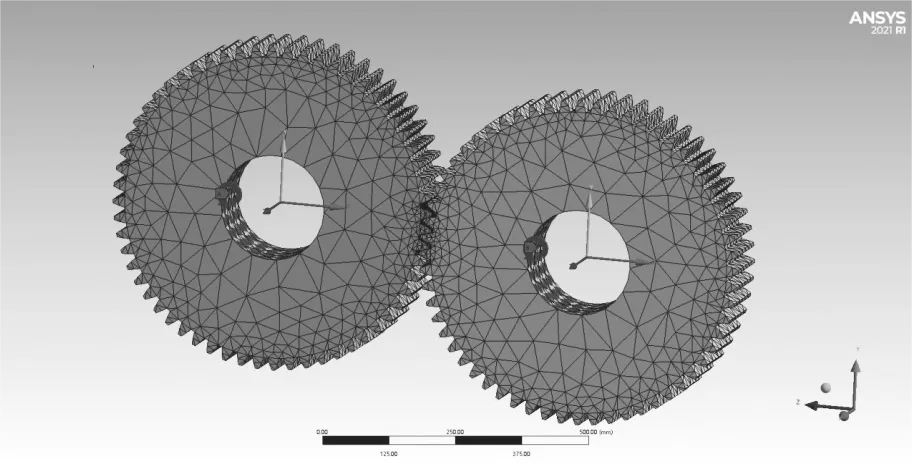選用 ANSYS/Workbench 中的瞬態動力學模塊,對同步齒輪的嚙合過程繼續動態仿真分析。齒輪嚙合分析主要針對齒輪的接觸壓力以及zui大等效應力特性。設置同步齒輪嚙合仿真時間為0.3s,選取28個齒面進行14對接觸,接觸類型為摩擦接觸,摩擦因數為0.2,法向剛度系數為1。根據同步齒輪的運動特性,確保齒輪只能繞 z 軸轉動。齒輪瞬態分析約束與載荷施加情況如圖8所示。