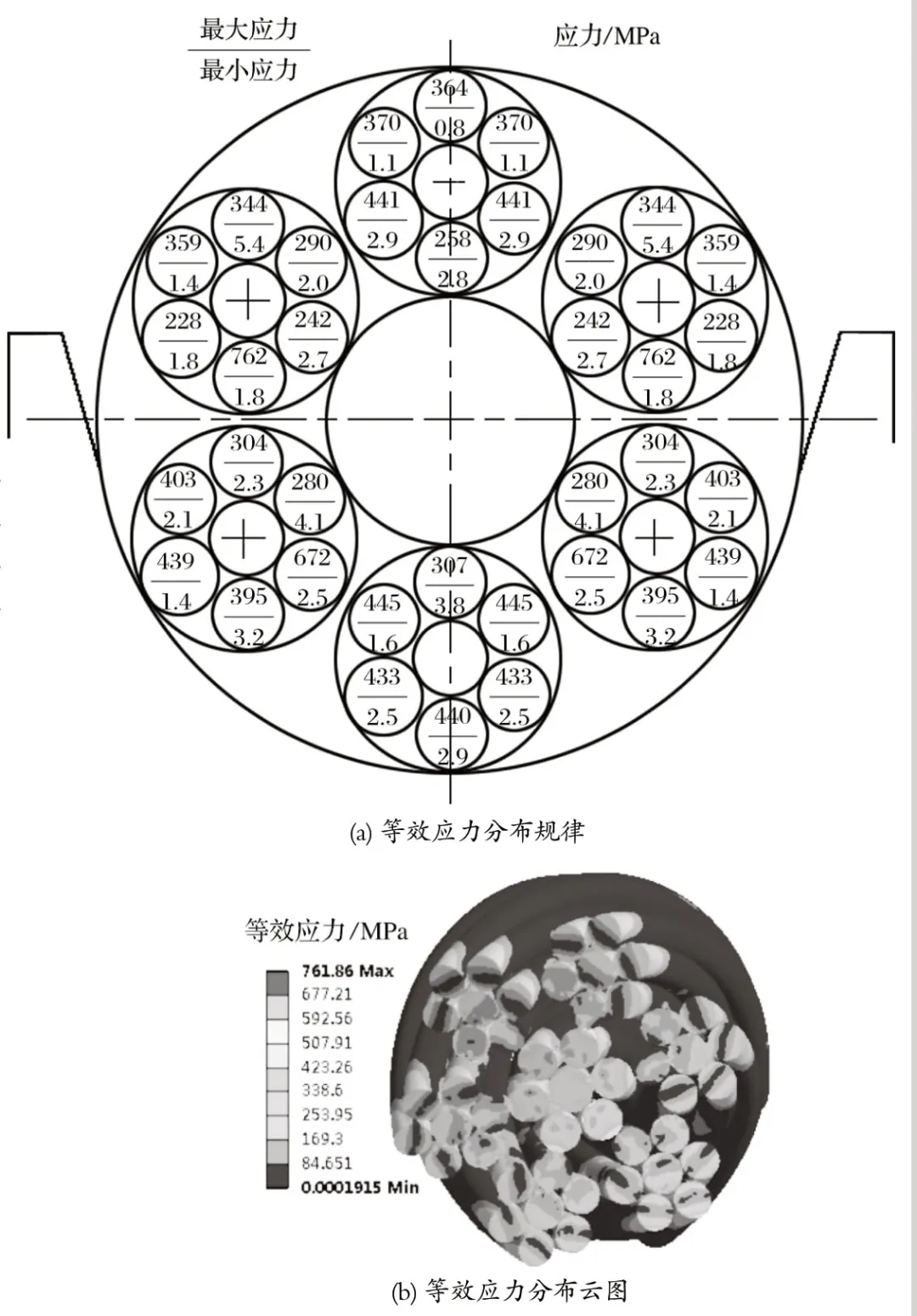 從圖6(a) 可以看出,鋼絲繩在受載作用時,此時的等效應力呈現(xiàn)出不均勻的分布形式,且存在層狀分布;鋼絲繩的應力受到空間位置和相位變化的影響,在繩槽的中 心軸線上下部分分布不均勻;從圖6(b) 可以看到,鋼絲繩截面上應力近似呈現(xiàn)對稱層狀分布,彈性區(qū)域和塑性區(qū)域相互交叉。鋼絲繩的外股層和接觸位置的應力比其他同股的應力較大,此時zui大值為 761.97 MPa,zui大應力分布在靠近中 心軸軸線上半部分的左右兩側(cè)。鋼絲繩的交互捻外層股二次捻制鋼絲繩中,靠近繩芯的位置應力比較大,zui大應力是1 121.78 MPa,分布在繩槽中 心軸線上半部分。通過對比圖4 可以看出,zui大應力主要集中在鋼絲繩的外側(cè),不同繩股層的鋼絲繩應力值不同。